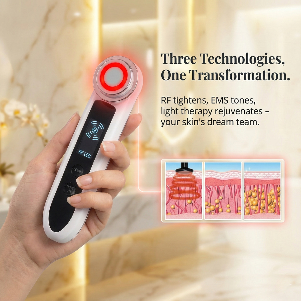 Unlock the power of advanced skincare with a multi-functional device that combines RF, EMS, and light therapy. The RF technology tightens and firms your skin, while EMS tones and sculpts. Meanwhile, the LED light therapy rejuvenates and promotes collagen production for smoother, younger-looking skin. Experience the ultimate at-home skincare treatment with this easy-to-use tool—your skin’s dream team for visible, lasting transformation.